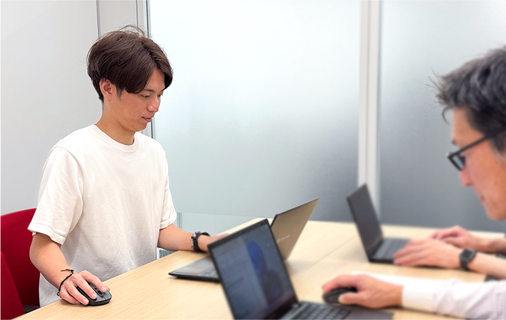 多様な部署の担当者と連携しながら業務を進める中で、スキルや知識の幅が広がることにやりがいを感じています。提案案件の全体調整を通じて、市場調査に基づく費用算出、プロジェクトマネジメントの視点、システム構成の検討など、幅広い分野に携わることで、自身の成長を実感しています。