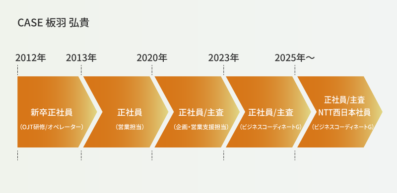 将来的には、当社の組織内でより上位の役職へキャリアアップし、会社や組織の課題解決に主体的に取り組む人材をめざしたいと考えています。また、他のNTTグループ会社の組織において、多様な業種・業務にチャレンジし、幅広い経験を積むことで、自身の視野を広げ、さらなる成長につなげたいという思いもあります。