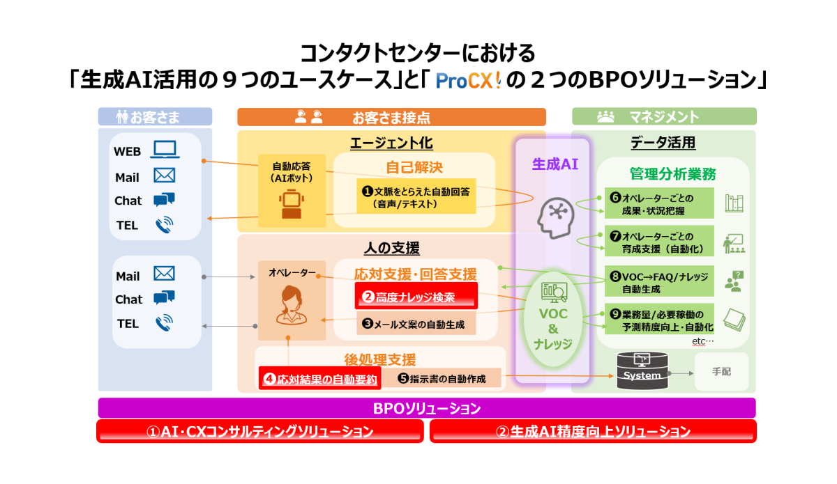 なお、本内容は2025年9月25日に当社が公表した「次世代型コンタクトセンターへの革新に向けた生成AI活用支援ソリューション」における「ProCX2つの生成AI活用BPOソリューション」を実践し、「生成AI活用9つのユースケース」を順次具現化している具体的事例となります。