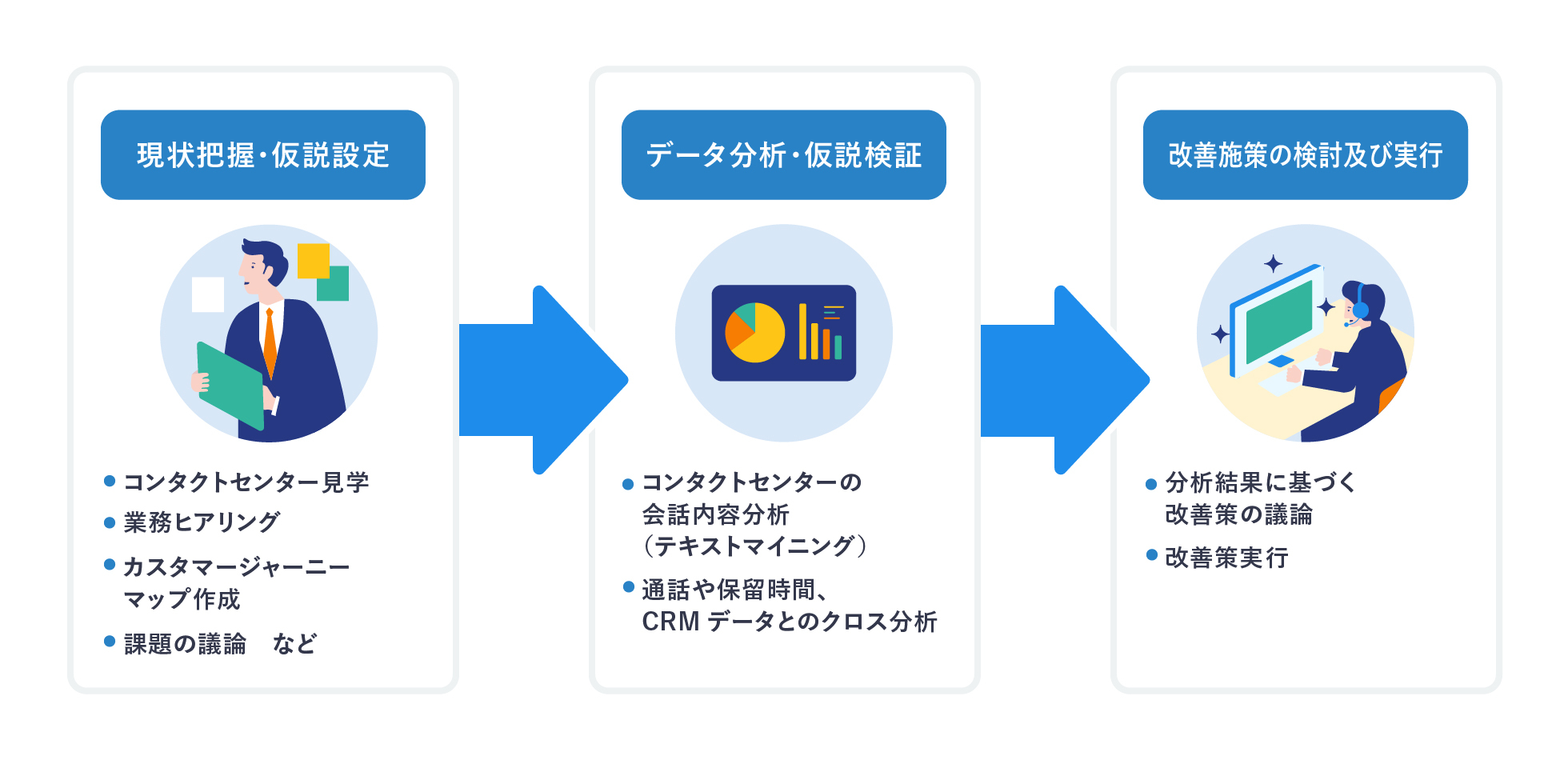 - 専門アナリストがコンタクトセンターの会話を分析し、VOCから課題を抽出